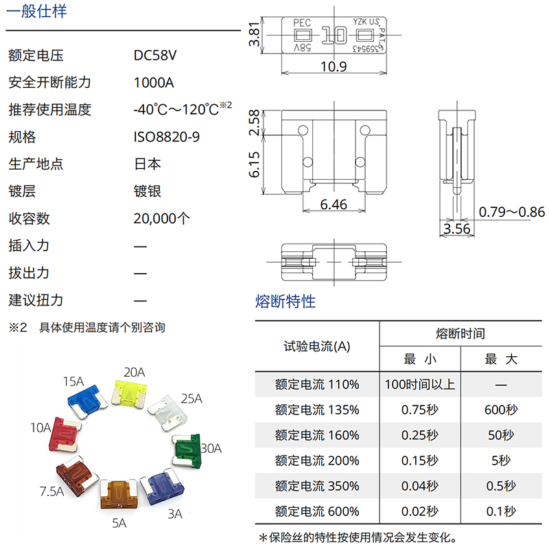 PEC日本太平洋精工汽车迷你平脚插片保险丝BFLP,将BFMN更加低成本化、小型化的片式保险丝,额定电压为DC58V,安全开断能力为1000A,使用温度范围-40℃~120℃,遵循ISO8820-9标准。