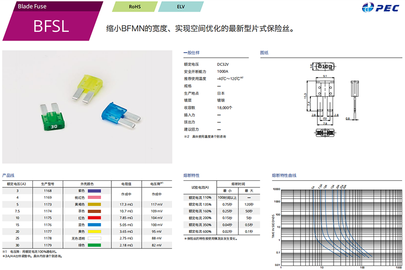 PEC日本太平洋精工汽车微型插片保险丝BFSL缩小BFMN的宽度、实现空间优化的最新型片式保险丝。额定电压 DC32V,安全开断能力 1000A,使用温度 -40℃~120℃,收容数 18,000,规格 ISO8820-12