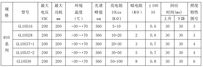 10系列可见光传感器光敏电阻GL10516GL10528GL10537GL10539