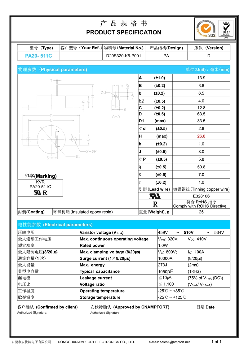 PA型压敏电阻器是设计有可靠安装及良好热传导的平板电极,可安装在机械振动强烈或产生较高热功耗的工业电子产品的应用场合。它是利用底部平板电极与压敏电阻芯片直接焊接,并用绝缘、阻燃材料进行封装而成的氧化锌压敏电阻器,安装结构可靠,热传导能力好。被广泛用于自动工业设备、电源控制、供水系统、石油设备、矿业设备、铁路信号系统等领域。
