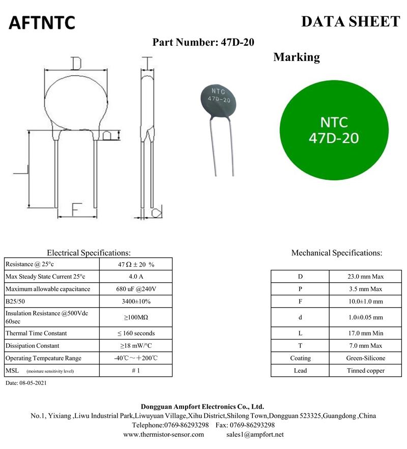 NTC 47D-20 Power NTC Thermistor NTC47D-20 is a crucial component for managing and stabilizing current flow in electrical circuits. By reducing inrush current, this NTC thermistor enhances the longevity and efficiency of sensitive electronic devices. It is widely employed in various industries due to its reliability and precision in temperature sensing.